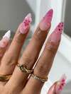 10 件法式尖头按压指甲长杏仁按压指甲粉色渐变 3D 花朵装饰和水波纹设计波尔卡圆点与珍珠水钻甜美风格表面光泽设计全覆盖假指甲适合女性和女孩日常佩戴