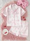 2 件套 Tween 女童樱桃和蝴蝶结印花翻领上衣搭配短裤,休闲舒适睡衣