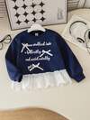 Genkimix Kids 女孩休闲时尚英文标语刺绣蝴蝶结装饰荷叶边下摆拼接灰色羊毛宽松落肩长袖圆领运动衫,秋季