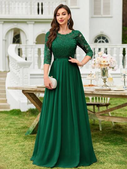 MIUSOL 花卉蕾絲上身絲帶腰百褶舞會連衣裙 - 墨綠色 - 查看 1