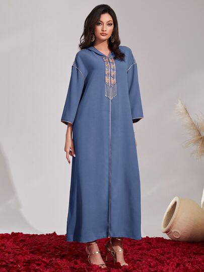 Al Najma 花卉圖案織帶流蘇細節拼接滾邊落肩袖摩洛哥連身袍 - 霧霾藍 - 查看 1