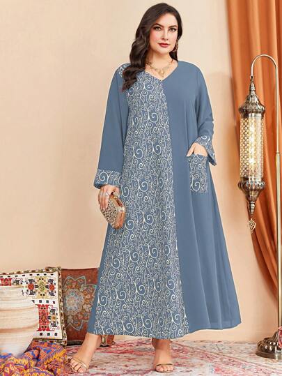Al Najma 大碼圖案印花口袋貼布連衣裙 - 霧霾藍 - 查看 1