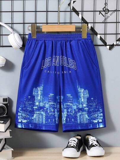SHEIN 男大童字母圖案彈性腰帶短褲 - 藍色 - 查看 1