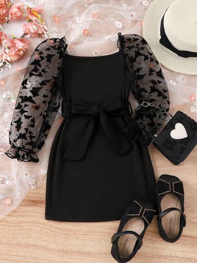 SHEIN 小女童網紗拼接荷葉袖連衣裙 - 黑色 - 查看 1