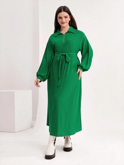 Seusyu 大碼落肩袖繫腰帶洋裝 - 綠色 - 查看 1