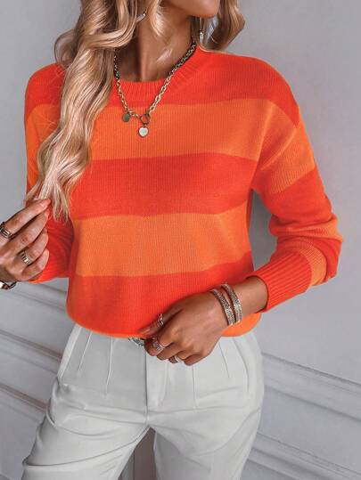 SHEIN LUNE 撞色落肩针织套头衫秋冬毛衣 - 亮橙色 - 查看 1