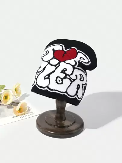 1 件针织字母提花图案帽子,休闲百搭防寒帽街头情人节 - 黑色 - 查看 1