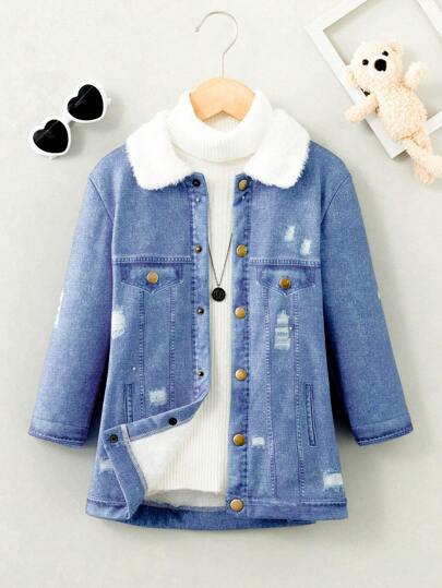 男童秋冬季加厚長款時尚外套,前面加有羊毛和扣子 - 藏蓝色 - 查看 1