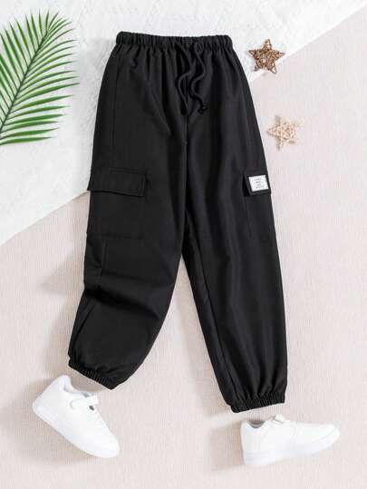 Sparklyn 女大童字母補丁細節翻蓋口袋腰部抽繩工裝褲 - 黑色 - 查看 1