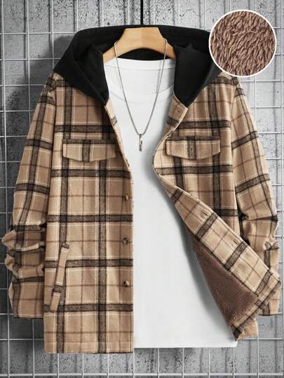 Manfinity RebelGame 宽松男士格子印花连帽大衣(不含 T 恤) - 卡其色 - 查看 1