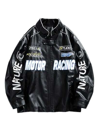 男士字母刺绣PU皮夹克,秋冬款 - 黑色 - 查看 1
