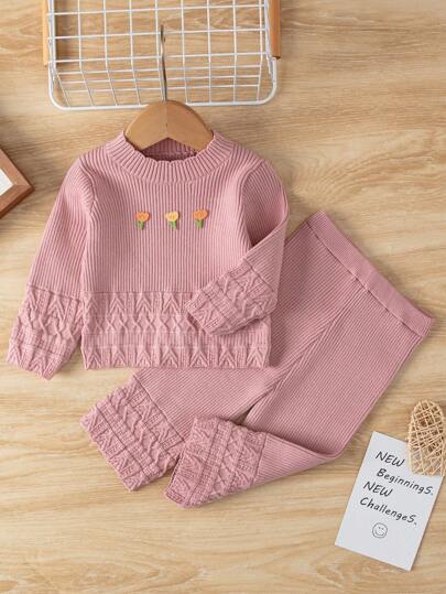 SHEIN 女嬰 3d 花朵裝飾毛衣和針織褲套裝 - 粉色 - 查看 1