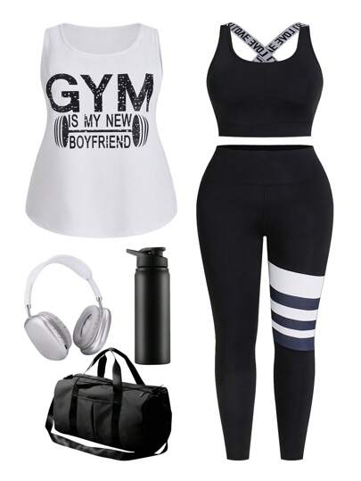 Easithlete 大尺碼女士運動套裝,字母印花圓領背心,交叉背心和條紋打底褲三件套健身瑜珈套裝 - 黑與白 - 查看 1