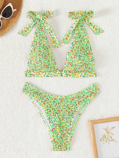 SHEIN Swim 女士碎花比基尼套装随机印花夏季海滩度假比基尼套装 - 彩色 - 查看 1