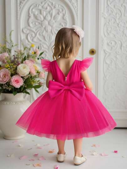 女婴纯色薄纱露背蝴蝶结蓬蓬裙,可爱花童礼服,适合户外派对,不含头饰 - 玫紅色 - 查看 1