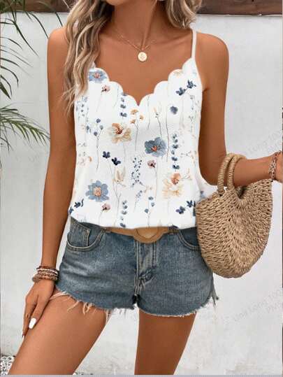 SHEIN Frenchy 女式夏季花卉印花休閒背心上衣,邊緣鋸齒式下擺 - 彩色 - 查看 1