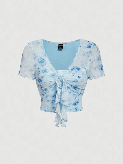 SHEIN MOD 女士浪漫粉色花卉印花夏季飘袖 T 恤 - 藍色 - 查看 1