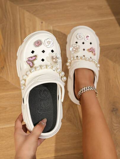 時尚高端白色中空高跟涼鞋,附可拆卸鏈條和紅色蝴蝶&小花飾,適合戶外和休閒穿著,是度假和大學夏季裝的完美搭配,具有楔形跟,由EVA製成 - 白色 - 查看 1