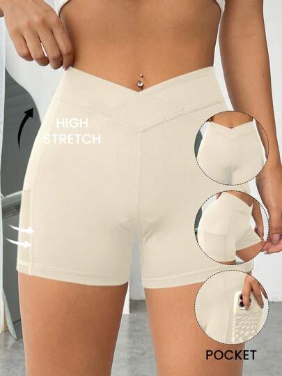 SHEIN EZwear 實心不對稱腰帶手機口袋側騎行短褲 - 杏色 - 查看 6