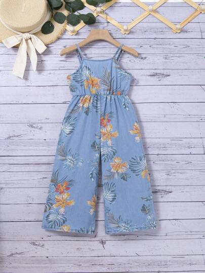SHEIN 年輕女孩藍色牛仔效果連身褲,帶花卉圖案 - 淺色水洗藍 - 查看 1
