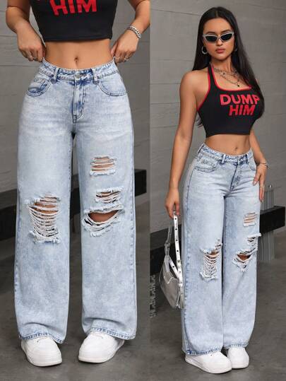 SHEIN EZwear 女款寬鬆褲腿破洞口袋牛仔褲 - 淺色水洗藍 - 查看 1