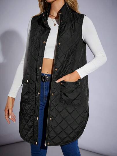SHEIN Tall 女士几何绗缝立领拉链四纽扣门管外大口袋加厚外套 - 黑色 - 查看 1