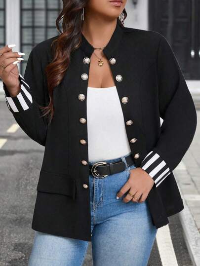 SHEIN LUNE 超大尺碼女士彩色拼接袖口極簡日常套裝 - 黑色 - 查看 1