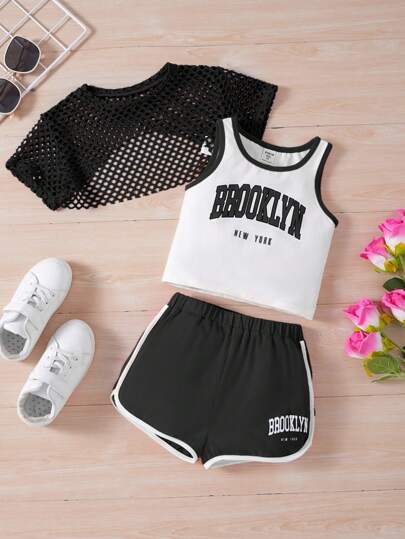 SHEIN 3 件女童针织网眼圆领短款上衣 + 针织无袖背心 + 针织宽松短裤套装 - 黑色 - 查看 1