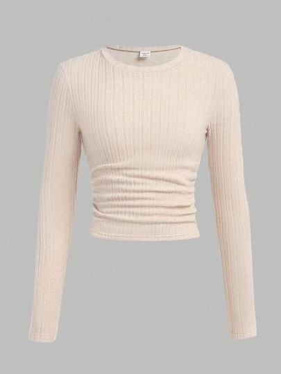 SHEIN Girlism 少女米色罗纹针织褶皱腰长袖 T 恤,秋冬 - 杏色 - 查看 1