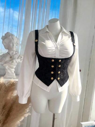 SHEIN MOD 大码女式黑色提花复古无袖衬衫 - 黑色 - 查看 1