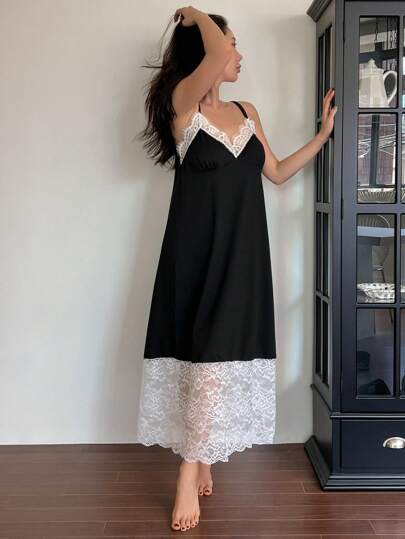 DAZY 女士缎面蕾丝吊带睡袍,配有可调节细肩带和露背设计睡衣 - 黑色 - 查看 1