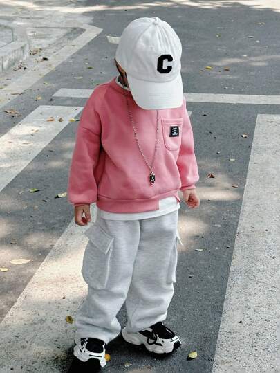 SHEIN Leap Crew 年轻男孩 2 件套休闲韩版宽松不对称下摆连帽运动衫配长裤套装,适合秋冬休闲装、万圣节、学校、节日外出 - 粉色 - 查看 1