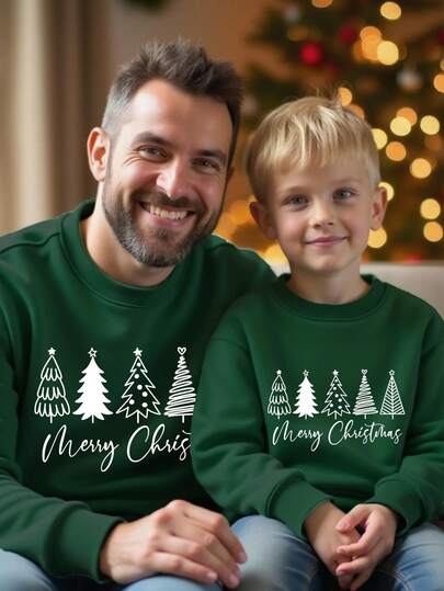 SHEIN 男士休闲圣诞快乐字母标语和线性圣诞树印花羊毛圆领运动衫,适合秋冬季圣诞节家庭聚会 - 墨綠色 - 查看 1