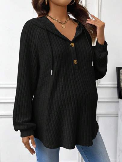 SHEIN 孕妇休闲纯色抽绳连帽长袖运动衫,运动衫,春秋季,孕妇装,冬季 - 黑色 - 查看 1