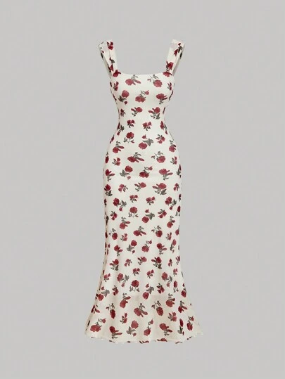 SHEIN MOD 复古花卉方领紧身露背连衣裙、夏季中长连衣裙、性感连衣裙、优雅连衣裙、飘逸连衣裙、舞会连衣裙 - 紅白色 - 查看 1
