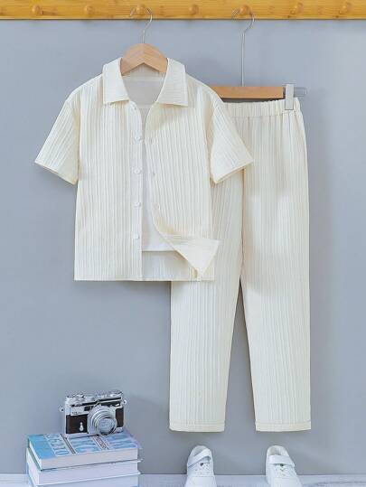 青少年男孩休闲百搭编织纹理条纹面料短袖衬衫和裤子套装,春夏 - 卡其色 - 查看 1