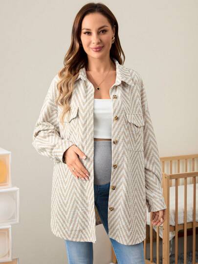 SHEIN 孕妇女士羊毛纽扣口袋夹克和长袖外套,适合秋冬季,秋冬季,保暖外套 - 杏色 - 查看 1