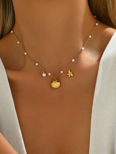1 件女士不锈钢 18K 镀金珍珠、贝壳和海星项链时尚珠宝 - 金色 - 查看 1
