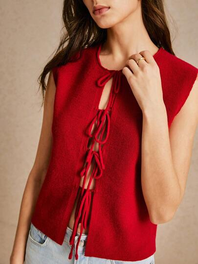 Poéselle 女士红色系带背心毛衣纯色无袖系带简约休闲毛衣背心秋装秋季毛衣秋季女装秋季服装红色女装女式背心圣诞节情人节复古 - 紅色 - 查看 1
