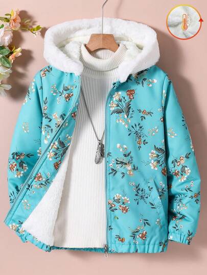 少女蓬松领连帽印花保暖内衬夹克 - 薄荷綠 - 查看 1
