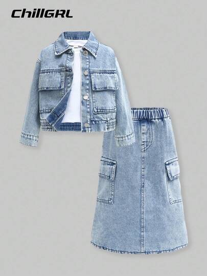 SHEIN Explorewe 女童时尚休闲舒适街头多口袋牛仔连体裤、音乐节服装 - 中等水洗藍 - 查看 1