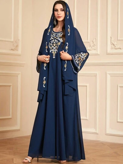 女士休闲圆领串珠刺绣优雅宽松端庄长袖阿拉伯连衣裙,搭配刺绣头巾、卡夫坦 - 藏蓝色 - 查看 1