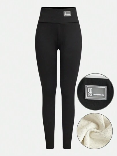 SHEIN Girlism 青少年女孩黑色高腰保暖加厚保暖内衬紧身裤冬季 - 黑色 - 查看 1