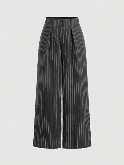 SHEIN MOD 女士大码休闲条纹阔腿裤,适合春秋季户外穿着 - 黑色 - 查看 1