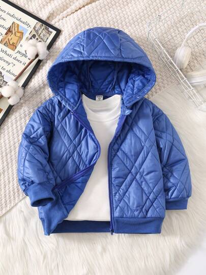 SHEIN Leap Crew 1 件男童休闲舒适保暖连帽短款蓝色棉服外套,适合外出、上学、日常聚会、秋冬季 - 寶藍色 - 查看 1