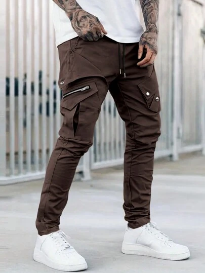 Manfinity Roughcore 男士休闲街头风格纯色抽绳腰部翻盖口袋工装裤,秋季 - 咖啡棕 - 查看 1