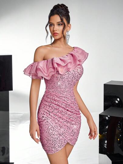 SHEIN Belle 女士纯色不对称领口裹身下摆鸡尾酒会礼服、返校节礼服、舞会半正式礼服、生日礼服、婚礼宾客礼服、毕业礼服、晚宴礼服、派对礼服 - 粉色 - 查看 1