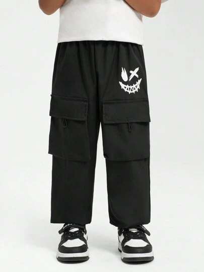 SHEIN 年轻男孩休闲时尚工装裤,带笑脸印花和大口袋设计,面料舒适,宽松版型,适合 4-7 岁男孩,适合春季、秋季、日常、学校、派对、娱乐 - 黑色 - 查看 1