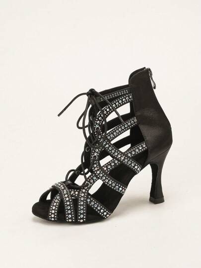1 双黑色缎面水钻时尚性感高跟爵士踝靴,适合拉丁舞 - 黑色 - 查看 1