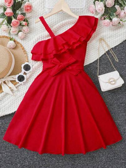 SHEIN 少女纯色荷叶边下摆不对称领口无袖时尚连衣裙,适合度假、夏季、旅行 - 玫瑰紅 - 查看 1